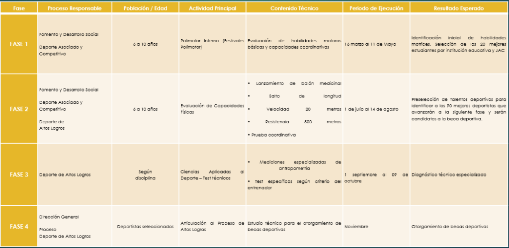 El programa tiene un alcance formativo y de proyección deportiva, dirigido a niños, niñas y jóvenes entre los 6 y 17 años, enfocado en la detección, seguimiento y proyección de talentos hacia el Deporte de Altos Logros, con participación progresiva en competencias del Sistema Nacional del Deporte.